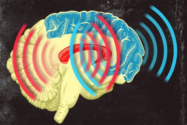 MIT neuroscientists found that brain waves originating from the striatum (red) and from the prefrontal cortex (blue) become synchronized when an animal learns to categorize different patterns of dots.