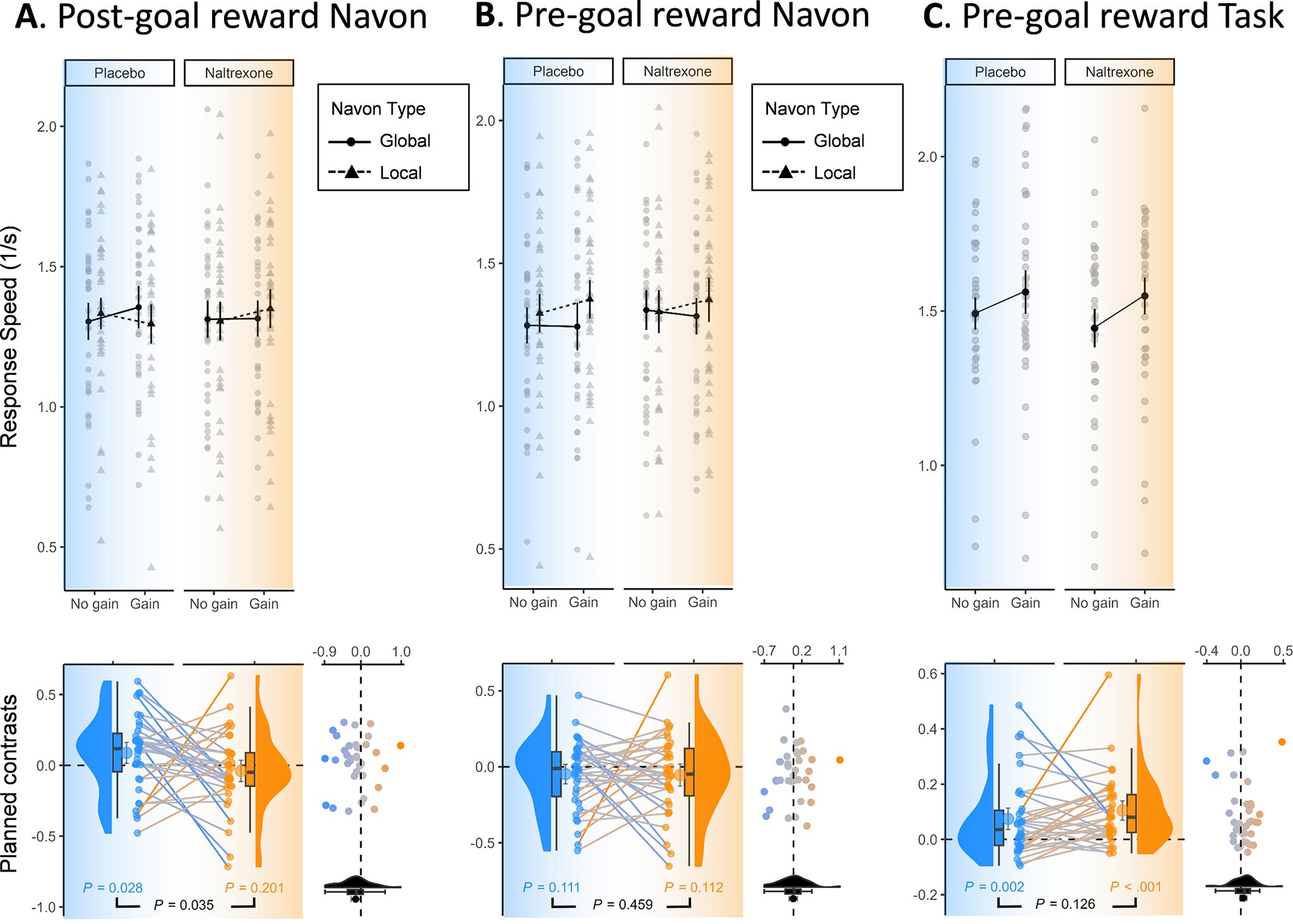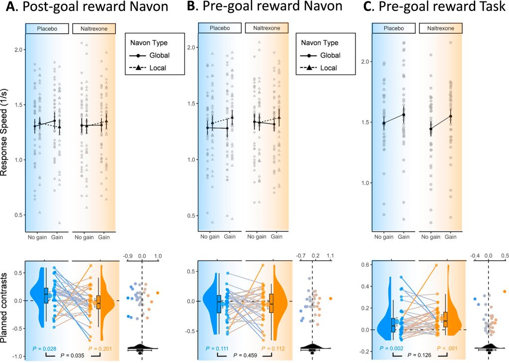 Opioid blockade (Naltrexone condition; right side) relative to placebo (Control condition; left side) selectively eliminated attentional broadening after reward receipt (A), but did not change attentional narrowing after reward anticipation (B) or reward-related performance speed on the lexical decision task (C). Credit: Psychological Medicine (2025).