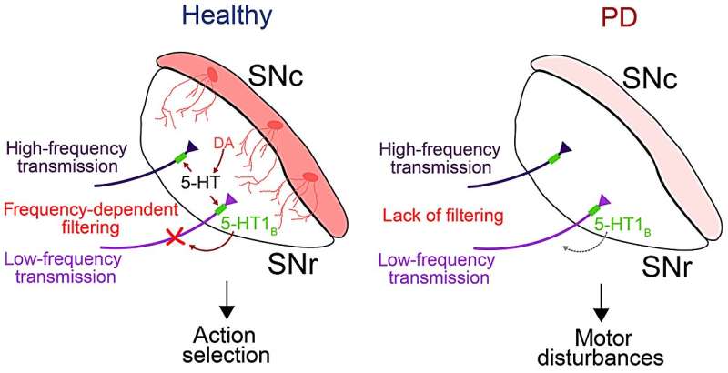 Illustration depicting a model of how DA and serotonin cotransmission shapes behaviour through frequency-dependent filtering of D1-MSN axons. Credit: Science Advances (2025)